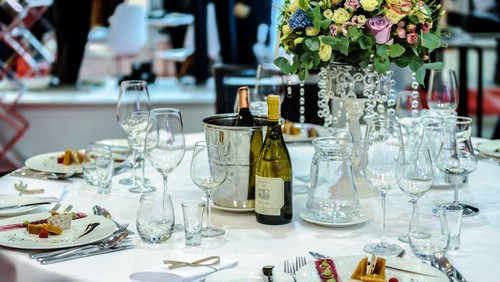 En stemningsfuld aften med hvide duge på bordet, dejlig middag, underholdning og kaffe.